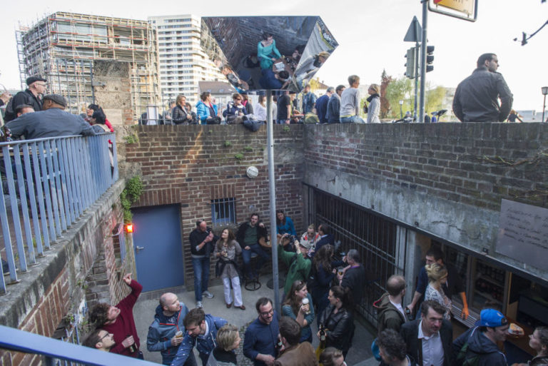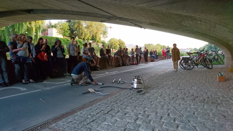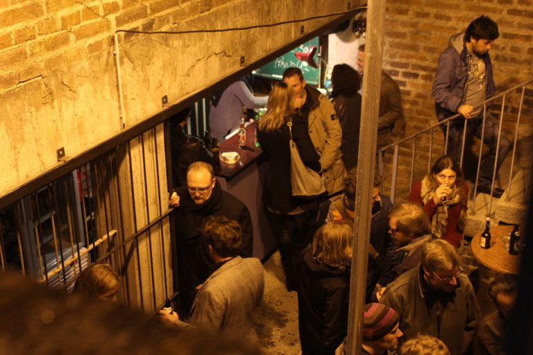 The staircase at Herdbrücke in Ulm is built into the historic city wall. It is located at the edge of the old town directly bordering the bank of the Danube river. The stairs had formerly served as a connection between the city and the river side and the space was equipped with public rest rooms. As measure of social control, access was restricted by the city since the 1980s and finally closed in the early 2000s. Since then, the place increasingly fell into disrepair and became infamous as “Müll-Loch” (garbage hole). In 2013, we included the site in the exhibition series “Kunst für Alle!”. A temporary installation by Nicolas Vionnet (CH) and Wouter Sibum (NL) played with the dynamics of the space in a humorous way. Instead of garbage falling down into the staircase, a 4m high fountain arose from it. During the project, the work met with a very positive response. The originally planned duration of 3 weeks turned into 3 months. During this time, the fountain became a meeting place for a small circle of the local cultural scene. This gave rise to the idea of continuing to use the staircase as an art venue with a bar. We carried this idea through the political authorities and initially got it approved for two years. In fact, the project called “Stiege” was run as an art venue from 2014 to 2019 and later continued as a bar.