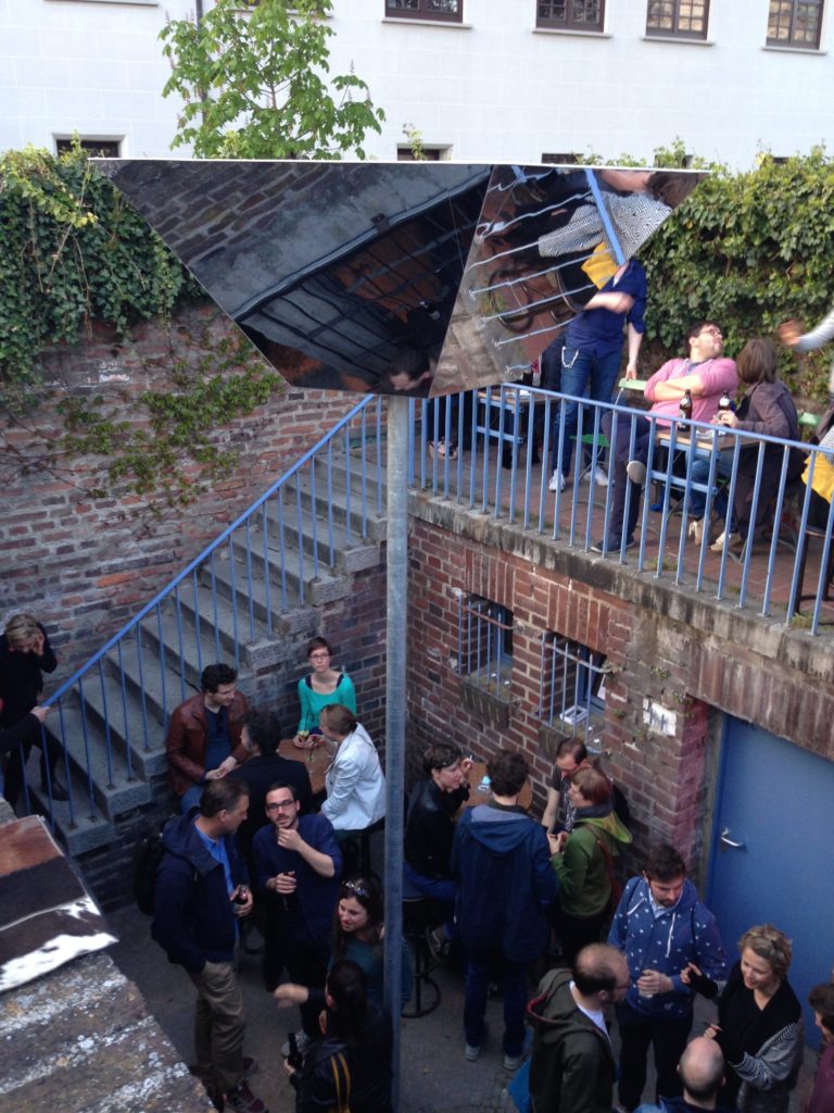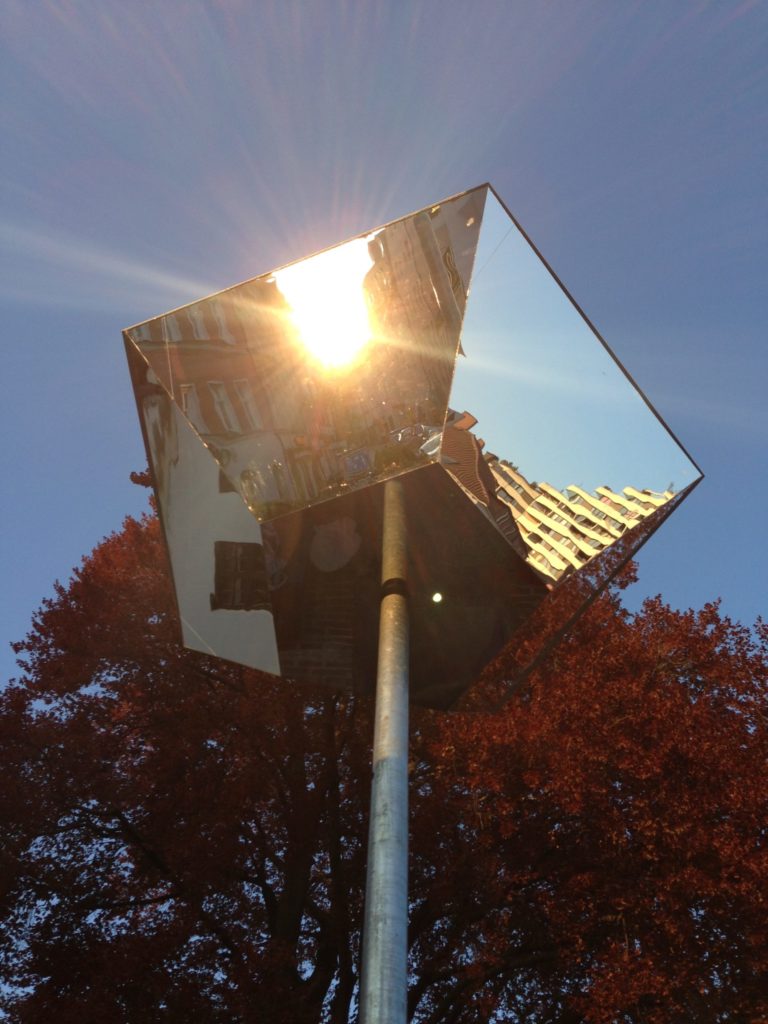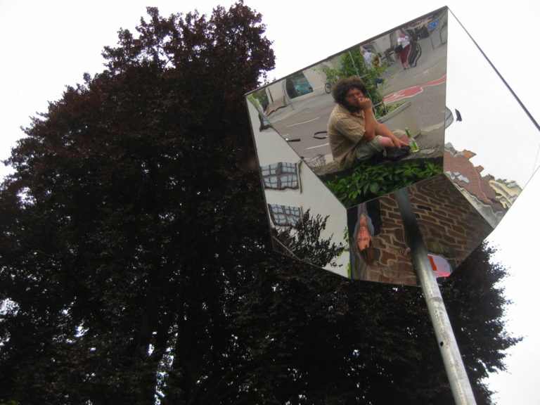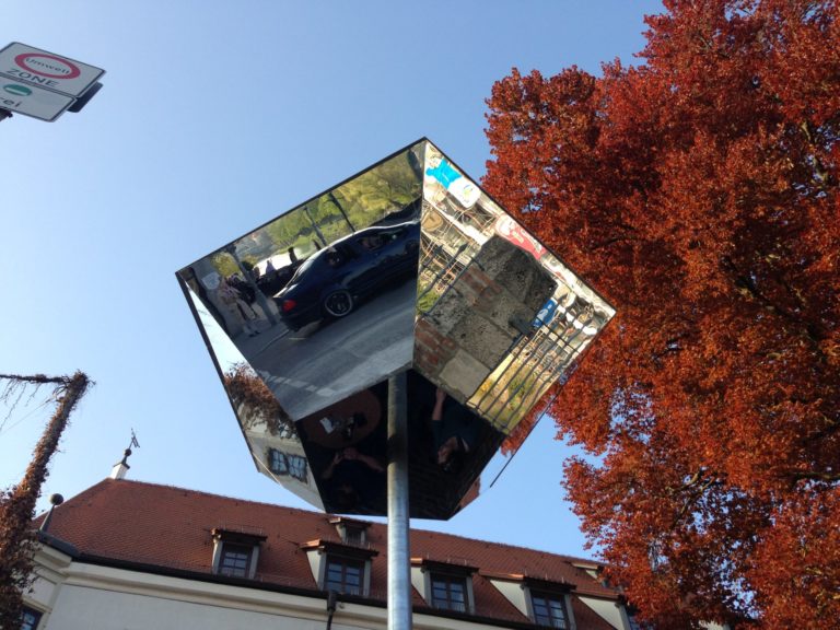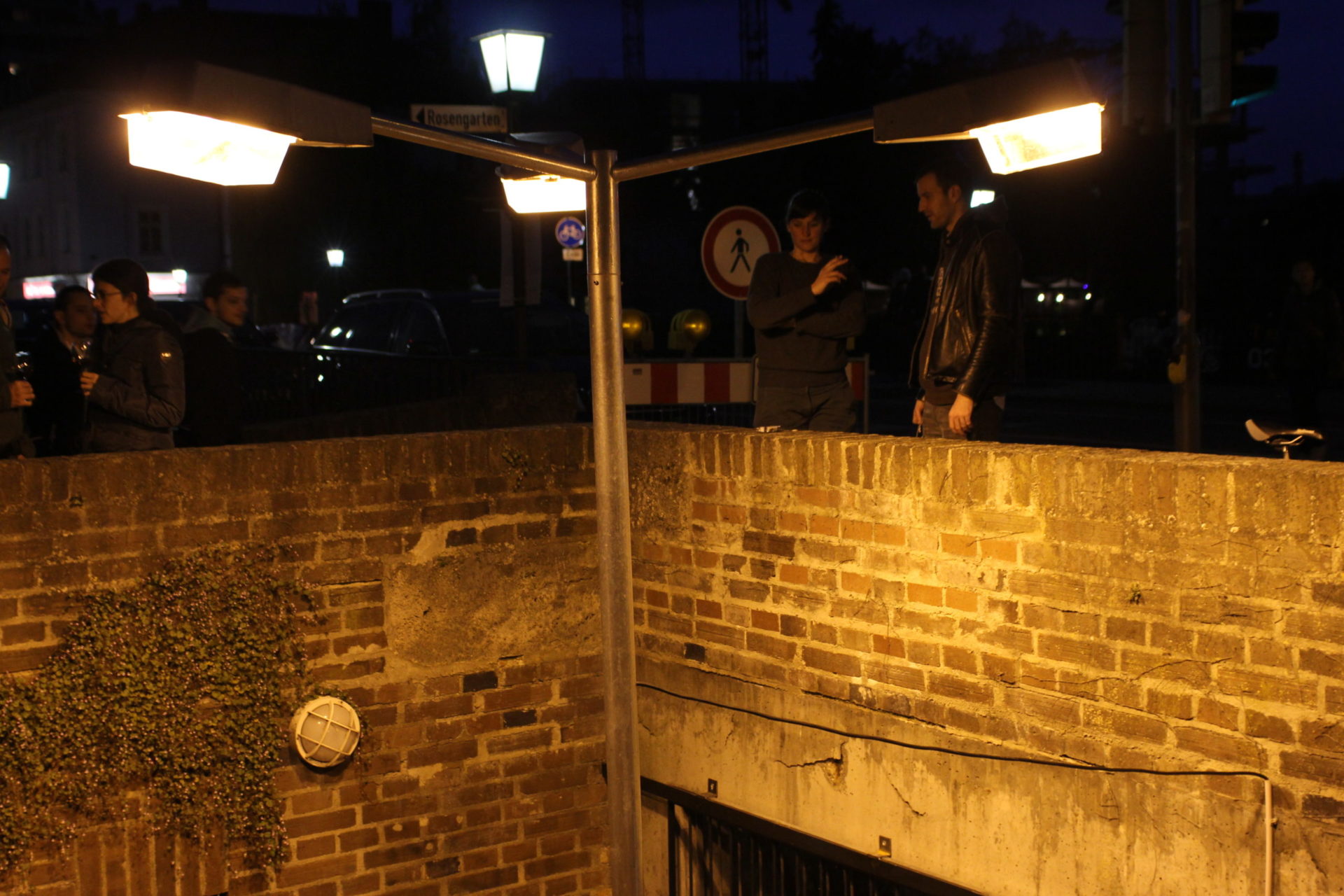 In the first two years artists were invited to develop site specific installations for Stiege. In 2014 Sofia Dona had a broken street lamp from Athens repaired and shipped to Ulm. Installed in the staircase, the lighting was clocked in the Greek time zone. In 2015, Sil Kroll installed a mirror sculpture that played with the idea of surveillance but also different layers of visibility in public space. It opened new lines of sight as for example from inside the staircase to the street level and even to the river. Besides artistic projects, Stiege hosted events like readings, concerts and discussions. In the following years, we conceptually opened the space for different artistic approaches and extended public art interventions, that we commissioned, to the wider city scape.